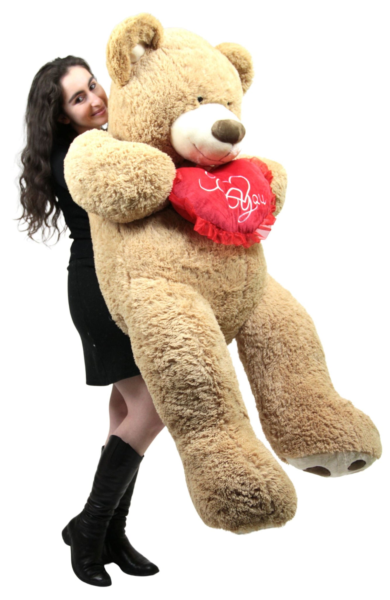 This Big Plush giant teddy bear provides a creative way to express love and affection, making it a heartwarming gift for Valentine's Day or any special occasion. Standing an impressive 60" tall, this big teddy bear 5 feet is generously stuffed with soft polyester, making it plush and huggable. Holding a big red heart pillow embroidered with "I LOVE YOU," the valentine teddy bear is sure to impress and delight. With its classic design, friendly expression, and adorable big-paw imprints, this giant teddy bear brings warmth and charm to any setting. More than just a cuddly companion, this stuffed bear is large enough to double as a cozy pillow or even a makeshift bed. Whether you're looking for a romantic surprise or a lovable plush friend, this gift is sure to make a lasting impression. Shipped in a huge box for an unforgettable unboxing experience, these giant plush stuffed animals provide an innovative way of sending a big, lovable hug to someone special.