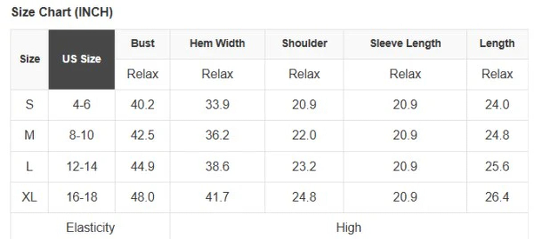 See size chart for approximate measurements