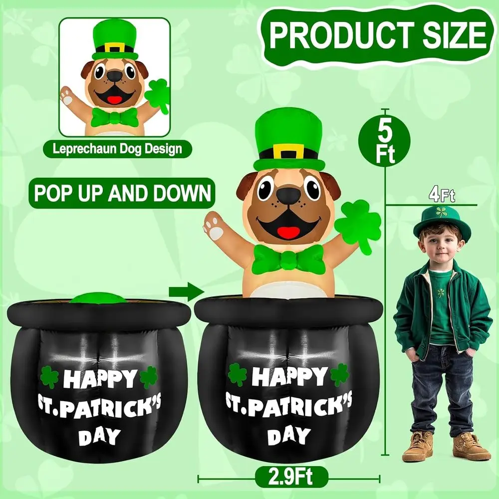 5 Ft Bulldog St. Patricks Day Iatables: St. Patricks iatables outdoor decoration with 3 lights features a dog handing a green shamrock and wearing a hat, up and down in a gold coin pot; Special design can catch the attention of neighbors and guests