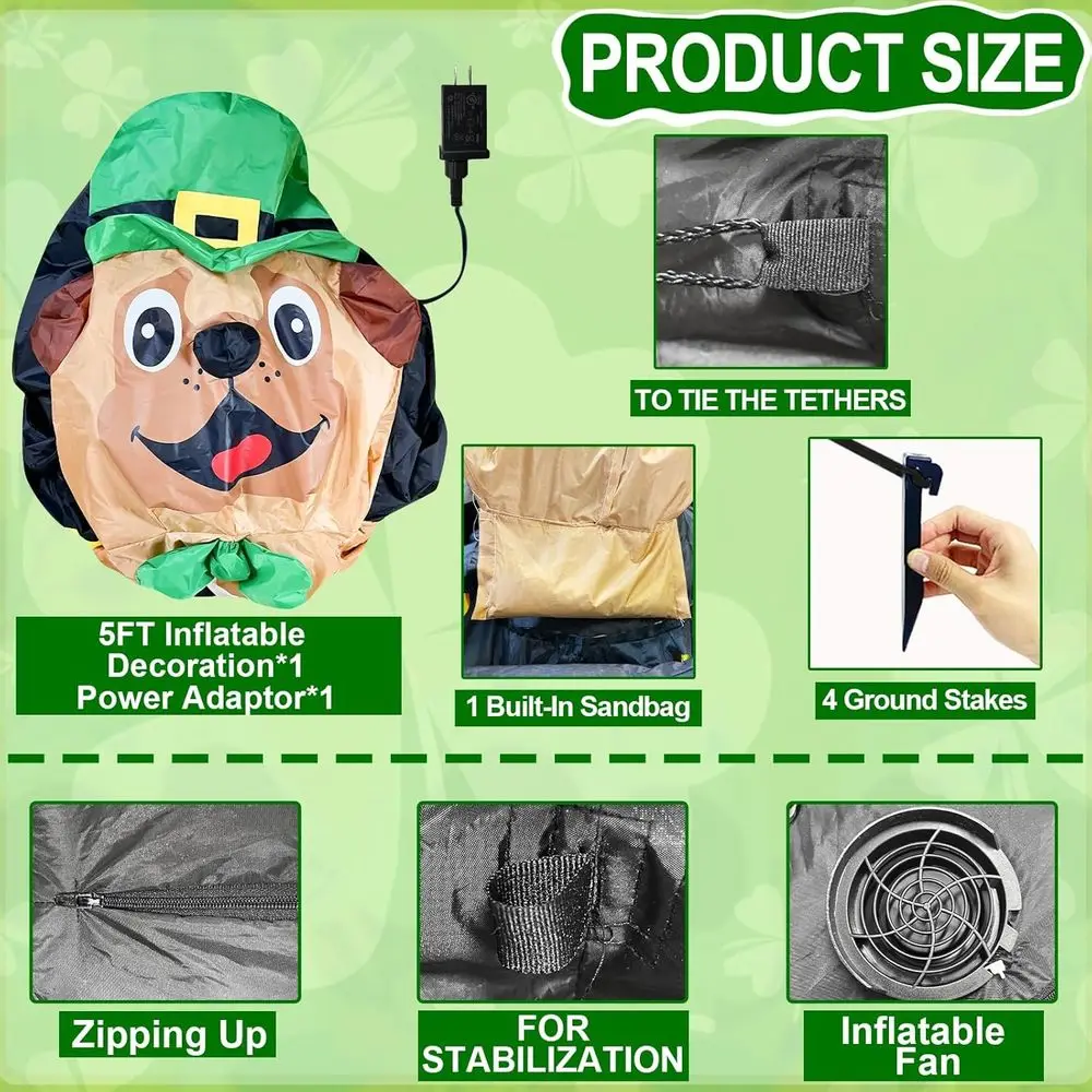 Easy Assembly: St. Patrick's blow ups with a built-in fan can iate in a few minutes with a power adapter; 4 plastic ground stakes, 2 ropes and sandbags secure it to ground; With zipper, iatables outdoor decor can quick deflate for easy storageEasy Assembly: St. Patrick's blow ups with a built-in fan can iate in a few minutes with a power adapter; 4 plastic ground stakes, 2 ropes and sandbags secure it to ground; With zipper, iatables outdoor decor can quick deflate for easy storage